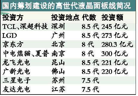截至目前,國家發(fā)改委批準(zhǔn)的高世代液晶生產(chǎn)線項目有昆山的龍飛光電、深圳的華星光電以及北京的京東方等國內(nèi)企業(yè)主導(dǎo)的項目,日本和韓國企業(yè)的項目還在焦急等待。