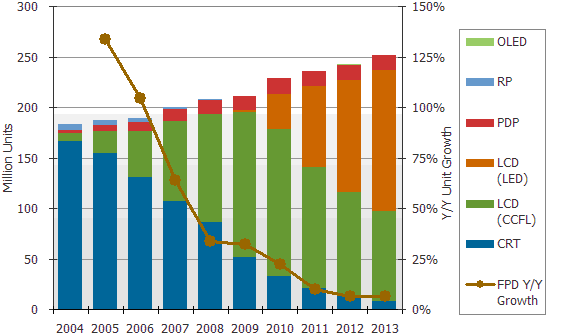 整體平面電視市場2009年表現相當亮眼,全球出貨量成長超過32%,與2008年的成長率相當接近。盡管受到經濟蕭條影響,某些區(qū)域市場如日本和中國大陸2009年成長率還比2008年好。對于2009年良好市場表現,DisplaySearch認為新顯示技術如3D 與LED推出有正面刺激作用;同時上修2010年全球電視出貨量預測,預估今年將達2億2千800萬臺,較先前預測增加1千萬臺。