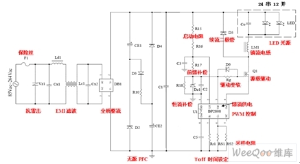 從AC220V看進去,交流市電入口接有1A保險絲F1和抗浪涌/雷擊的壓敏電阻Vz1;之后是EMI濾波器,由Ld1、Lc1和Cx1、Cx2組成;DB1是全橋整流器,內(nèi)部是4個高壓硅二極管;CE1、CE2、R10、D2~D4組成無源功率因數(shù)校正電路;BP2808芯片由R15、R16啟動電阻降壓經(jīng)R17、C3前饋補償,并由Dz1、C2、R18與BP2808內(nèi)部電路組成專利的恒流補償電路穩(wěn)壓后給BP2808控制電路供電,系統(tǒng)啟動后由于控制電路本身靜態(tài)電流小,以及芯片內(nèi)部存在從OUT到VCC的饋流二極管可向BP2808提供工作電源,此時電阻R15-17上通過的電流將大大降低,因而總的系統(tǒng)功耗也大大降低,系統(tǒng)效率得到明顯提高。