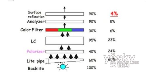 首先,這種方法省去了彩色濾色片,而濾色片是光能的主要吸收者,它會損失光能70%以上。下圖表明了光能從光源出發(fā)以后所受到的損失。