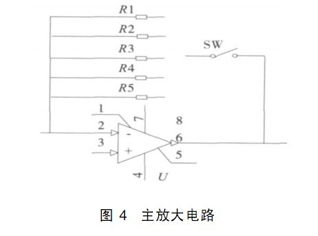 由仿真結(jié)果可以看出光電二極管產(chǎn)生的微安級(jí)的弱光電流經(jīng)前置放大電路可輸出毫伏級(jí)的電壓,所以仍需通過(guò)主放大電路進(jìn)行后續(xù)處理。 主放大電路如圖 4 所示; R 1~ R 5 電阻可實(shí)現(xiàn)電壓放大倍數(shù)的多檔可調(diào),即所謂的靈敏度調(diào)節(jié)。