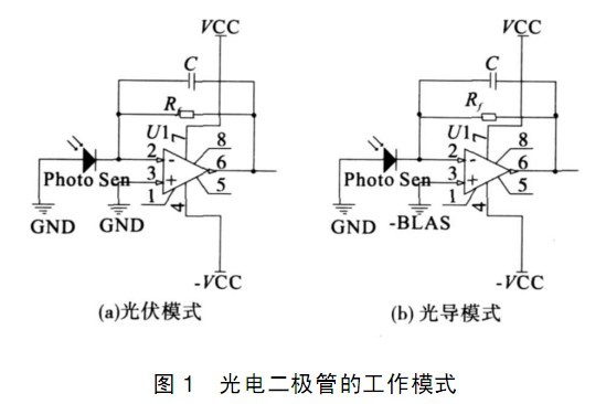 光電二極管可以在2 種模式下工作, 一是零偏置的光伏模式; 一是反偏置的光導(dǎo)模式,具體電路如圖1 所示。 在光伏模式時(shí), 光電二極管可以非常精確地線性工作; 而在光導(dǎo)模式時(shí), 光電二極管能夠?qū)崿F(xiàn)較高的切換速度, 但要犧牲線性; 同時(shí), 反偏置模式下的光電二極管即使在無(wú)光照條件下也會(huì)產(chǎn)生一個(gè)極小的暗電流, 暗電流可能會(huì)引入輸入噪聲。 因此選用光伏模式。