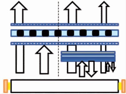 為了使用盡可能少的LED而又保持良好的光學(xué)特性,本文設(shè)計(jì)的LED背光選用了1層擴(kuò)散膜、2層棱鏡膜和1層雙層增亮膜(DBEF),膜材參數(shù)如表1所示。擴(kuò)散膜可以改變LGP出射的光路,讓射出的光更加均勻;還可以隱藏LGP 上的dot,使從正面看不到散射點(diǎn)的影子,擴(kuò)大視野角,提升輝度。棱鏡膜即增亮片,主要利用全反射和折射定律,將分散的光集中于一定角度范圍內(nèi)出射,從而提高該范圍內(nèi)的亮度。DBEF 是本文LED背光模組的關(guān)鍵膜材,可以使整個(gè)模組的亮度提升一倍,其工作原理如圖2所示。DBEF可以將不能通過下偏光片的光線反射回背光,經(jīng)背光的二次反射,部分光線又可以通過DBEF和下偏光片出射。經(jīng)過多次回收和利用,光的透過率得以大幅提高。