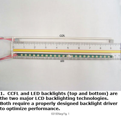 典型的LCD背光可以是1個或多個冷陰極熒光燈(CCFL),或是一組發(fā)光二極管(LED)陣列。圖1分別給出了采用這兩種技術(shù)的一個例子。背光圖像的質(zhì)量在很大程度上取決于背光驅(qū)動器。在本文中,我們將討論有助于CCFL和LED發(fā)展的一些注意事項,以及如何為這兩種背光供電。