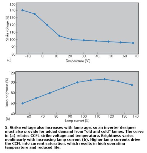 LCD工作時的環(huán)境溫度是背光驅(qū)動器設(shè)計人員需要考慮的一個關(guān)鍵因素。CCFL啟動或起始電壓與溫度成反比。圖5a顯示了CCFL起始電壓與溫度之間的典型關(guān)系,圖5b則展示了與電燈電流增大相關(guān)的CCFL亮度變化曲線。