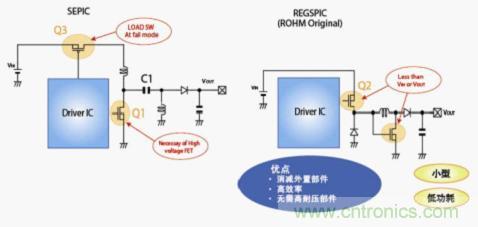面對(duì)車載特有的電池電壓波動(dòng)和多樣化的LED燈數(shù),以升壓方式和降壓方式很難進(jìn)行LED的閃爍控制與平臺(tái)設(shè)計(jì),要滿足市場(chǎng)所要求的高可靠性與縮短開發(fā)周期之間的平衡實(shí)屬不易。因此,為了不依賴電池電壓、可以始終穩(wěn)定供給DC/DC轉(zhuǎn)換器輸出電壓,ROHM采用了一種稱為“REGSPIC結(jié)構(gòu)”的獨(dú)有升降壓方式。下面介紹REGSPIC結(jié)構(gòu)與一般的升降壓方式所用的SEPIC結(jié)構(gòu)相比所具有兩個(gè)優(yōu)點(diǎn)。