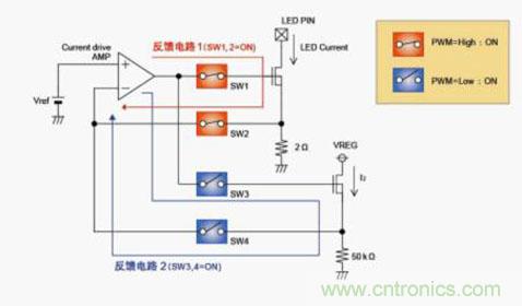 這兩條反饋通路由各SW進(jìn)行切換。在PWM=High(LED為ON)區(qū)間,驅(qū)動(dòng)LED電流輸出用的反饋電路(圖3反饋電路1),由LED引腳灌入LED電流。在PWM=Low(LED為OFF)區(qū)間,驅(qū)動(dòng)另一條反饋電路(圖3反饋電路2),由內(nèi)部恒定電壓VREG產(chǎn)生電流。通過進(jìn)行這樣的控制,LED電流雖然是關(guān)斷的,但電流驅(qū)動(dòng)放大器始終處于驅(qū)動(dòng)狀態(tài),PWM=Low→High時(shí)可平穩(wěn)生成LED電流。由于反饋通路2的電流I2已設(shè)定為數(shù)μA,因此,本電路結(jié)構(gòu)的功耗增加量已達(dá)到可以忽視的水平。
