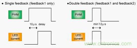 圖4為L(zhǎng)ED電流在有無與輸出不同的反饋通路時(shí)對(duì)PWM信號(hào)的跟隨性如何變化的比較數(shù)據(jù)。