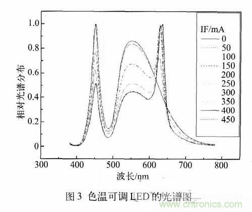 圖3為采用遠(yuǎn)方HASS-2000高精度快速光譜輻射計(jì)測量得到的色溫可調(diào)LED的光譜圖,從圖中可以看出,隨著紅光LED電流的變化(從0到450mA),LED的相對光譜也會隨之變化,LED的光譜有三個(gè)峰值,分別在450nm、550nm和628nm,暖色溫的發(fā)光效率大于68lm/W,冷色溫的發(fā)光效率達(dá)到87lm/W。