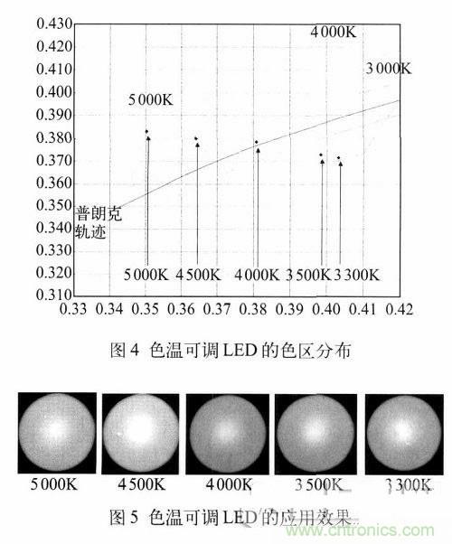 圖4列出了色溫可調(diào)LED的色區(qū)分布隨紅光LED電流的變化,表1列出了色溫可調(diào)LED的光學(xué)性能參數(shù)隨紅光LED電流的變化,可以看出,紅光LED不加電流的情況下,LED的色溫為5000K,在冷色溫BIN區(qū),隨著紅光LED電流的逐漸增加,