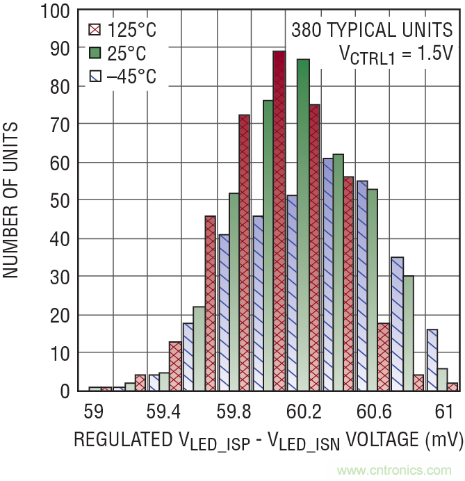 圖 1 顯示了當(dāng)模擬控制輸入為 0V 時,隨溫度變化 LT3744 失調(diào)電壓的生產(chǎn)一致性,在這里,典型器件數(shù)量為 380 個。憑借誤差放大器的低失調(diào),控制環(huán)路在 1/20 標(biāo)度模擬調(diào)光時,能夠?qū)崿F(xiàn) ±10% 的典型準(zhǔn)確度。圖 2 顯示了當(dāng)控制輸入等于 1.5V 時,穩(wěn)定電壓在多個 LED 電流檢測引腳上的分布。滿標(biāo)度范圍的準(zhǔn)確度好于 ±3%,這相當(dāng)于在 60mV 滿標(biāo)度調(diào)節(jié)電壓時準(zhǔn)確度為 ±1.8mV。