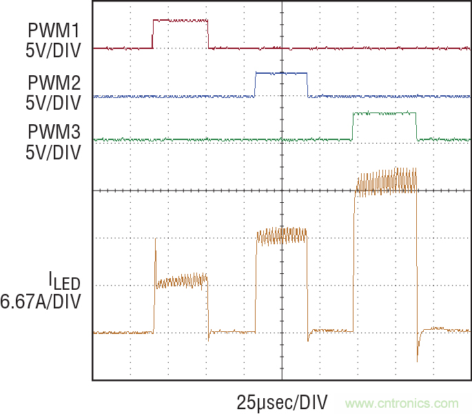 3 種不同電流狀態(tài)之間的 PWM 調(diào)光如圖 5 和圖 6 所示。在圖 5 中,PWM 信號順序接通和斷開。PWM3 的優(yōu)先級最高,PWM1 則最低。這允許單一輸入信號快速轉(zhuǎn)換,以改變輸出電流。如圖 6 所示,PWM 輸入信號之間可以有任意長短的時間間隔。