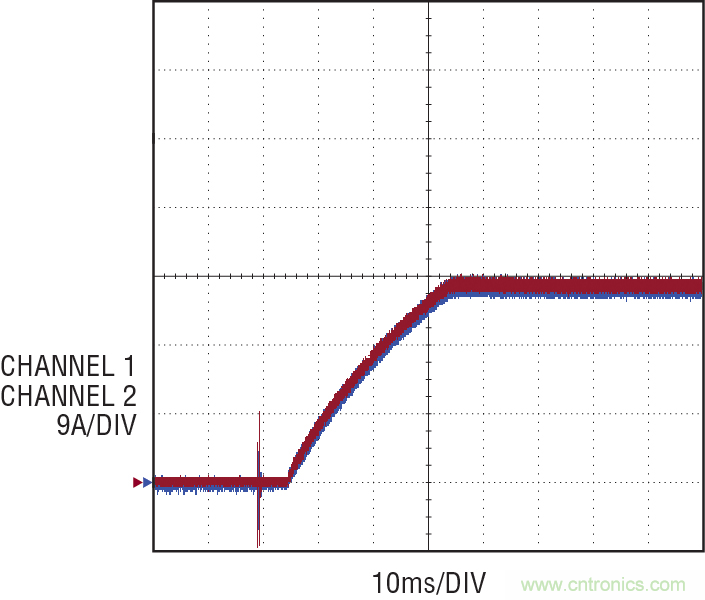 圖 8 顯示了一款 324W 轉(zhuǎn)換器,由兩個ADI DC2339A 演示電路板并聯(lián)組成。在這款設(shè)計中,每個并聯(lián)的控制器都產(chǎn)生 27A 電流,總共產(chǎn)生 54A 電流,電壓為 6V。通過將相應(yīng)的補償輸出連接到一起,兩個控制器協(xié)調(diào)一致地運行,以提供平滑、良好的啟動和準(zhǔn)確的 DC 調(diào)節(jié)。