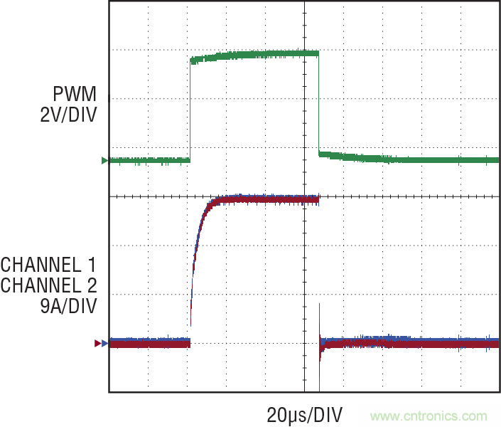 在這個應(yīng)用中,可以對兩個獨立的 LED 串在 54A 滿電流時進(jìn)行 PWM 調(diào)光。進(jìn)行 PWM 調(diào)光時,圖 12 顯示,LED 電流在兩個驅(qū)動器之間是完全地均分的。在這個測試中,LED 電流從 0A 到 54A 的上升時間為 6.6µs。從每個驅(qū)動器輸出到 LED 的電氣連接必須仔細(xì)平衡,以避免在任一通路中增加電感,這會縮短有效上升時間。