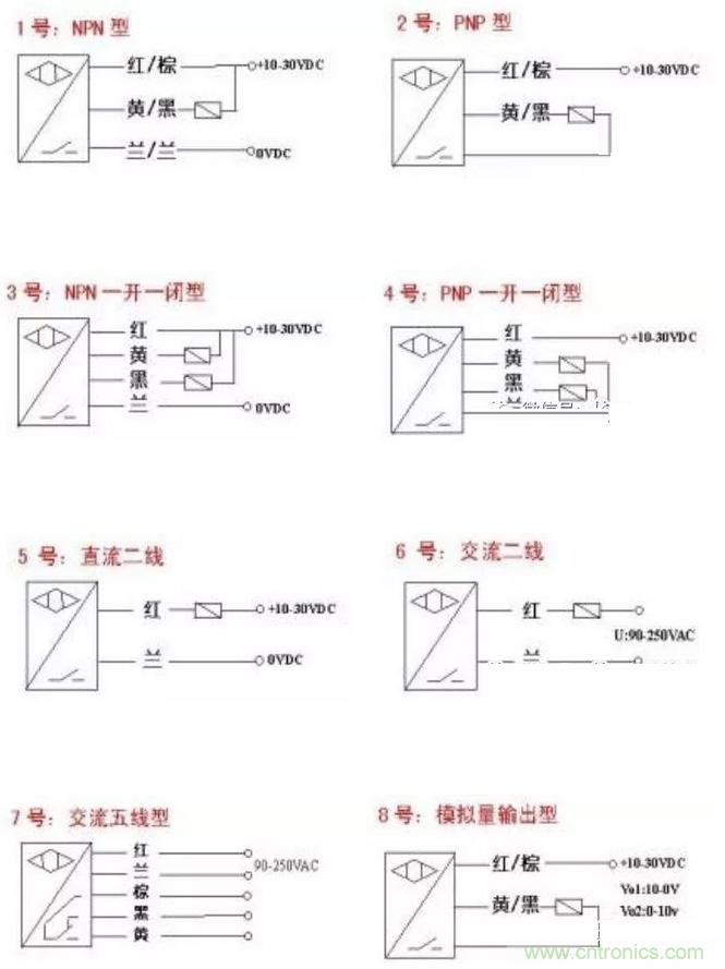 1)接近開關有兩線制和三線制之區(qū)別, 三線制接近開關又分為 NPN 型和 PNP 型,它們的接線是不同的。請見下圖所示: