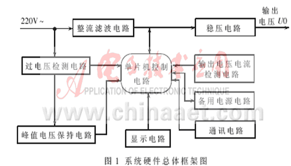 系統(tǒng)硬件框架如圖1所示。在正常的情況下,220V的交流輸入電壓經(jīng)過整流、濾波、DC/DC變換、穩(wěn)壓電路后可得到一個穩(wěn)定的輸出電壓,基本上是一個開關(guān)電源;當有過電壓時,過電壓信號經(jīng)過過電壓檢測電路檢測和峰值電壓保持電路保持,控制電源回路,斷開正常工作的交流電路,同時通過計算機啟動備用電源工作,以及完成對過電壓的瞬時值和峰值的測量。