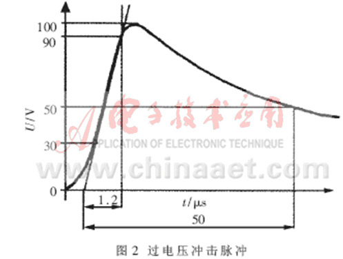 過電壓對于電源來說是一個非常有害的信號,雷電等引起的瞬時高電壓如果不加遏制,直接由電源引入RTU(遠程終端設(shè)備)則會影響其電源模塊的正常工作,使各功能模塊的工作電壓升高而工作不正常,嚴重時會損壞模塊,燒壞元器件(IC)。典型過電壓形成的沖擊電壓脈沖如圖2所示。