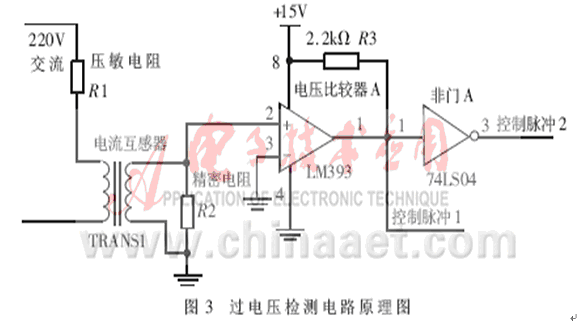 過電壓檢測電路原理圖如圖3所示。當有過電壓信號產(chǎn)生時,壓敏電阻被擊穿,呈現(xiàn)低阻值甚至接近短路狀態(tài),這樣在電流互感器的原級產(chǎn)生一個大電流,通過線圈互感作用在副級產(chǎn)生一個小電流,再通過精密電阻把電流信號轉(zhuǎn)變?yōu)殡妷盒盘?;這個信號輸入到電壓比較器LM393后,電壓比較器LM393輸出高電平,經(jīng)過非門A輸出的控制脈沖1控制電源回路,斷開開關(guān)電源電路,啟動備用電源。控制脈沖2 送到單片機的中斷口,單片機控制回路啟動A/D轉(zhuǎn)換,采樣過電壓的瞬時值。