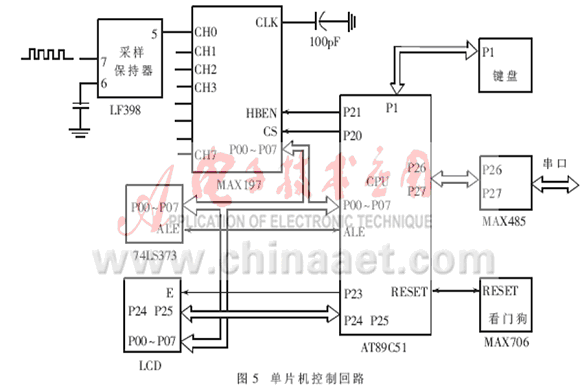 單片機控制回路如圖5所示。它的主要功能是完成對過電壓的瞬時值和峰值的檢測、過電壓次數(shù)的檢測、電源輸出電壓和電流的檢測,并通過鍵盤的操作顯示出各個檢測值的大??;同時通過485接口和上位機實現(xiàn)通訊,在有過電壓的時候通過控制回路啟動備用電源,實現(xiàn)對電源本身的保護。