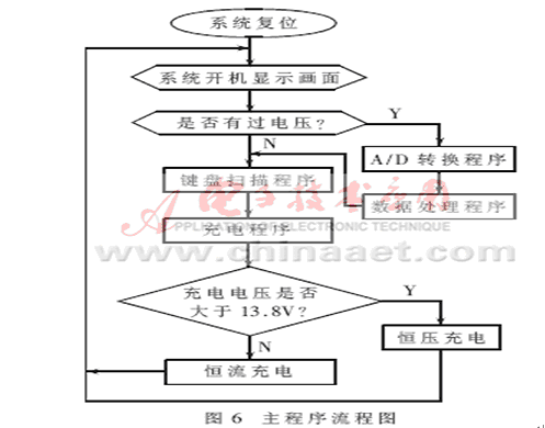系統(tǒng)軟件主要由主程序、鍵盤掃描子程序、顯示子程序和通信子程序等組成。圖6是主程序流程圖。