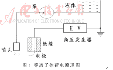 圖1所示為等離子體荷電原理圖,當(dāng)在電極上施加一定的脈沖高壓時,窄脈沖電暈放電中產(chǎn)生的高能電子能使氣體電離成正、負(fù)離子,同時在空間電場中,由于高壓脈沖上升沿陡峭,電子可瞬間加速,而離子幾乎不加速。在這種放電等離子體中,電子溫度特別高,可形成大量的激發(fā)態(tài)分子,各種極富反應(yīng)的自由基將會引發(fā)氣體分子電離。在電極附近,極性與電極極性相異的離子被電極吸附,與電極極性相同的離子受電排斥并在周圍形成離子區(qū)[1]。當(dāng)藥液在泵或其他外力的作用下由噴頭霧化后形成霧滴并通過電離區(qū)與離子碰撞時,就把電荷傳給霧滴,使霧滴荷電。而霧滴又對離子產(chǎn)生排斥力,使充電速度下降,直至充電停止而達(dá)到飽和。