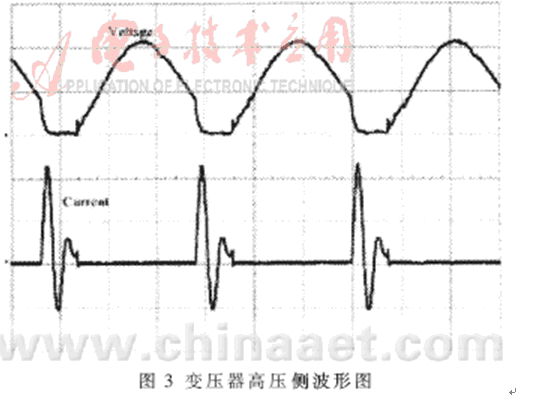 研制的高壓窄脈沖電源改善了高壓荷電系統(tǒng)的性能且穩(wěn)定性好。實際運(yùn)行表明,電源輸出電壓峰值為0~30kV,頻率為15kHz,脈寬為500ns~800ns。脈沖供電與直流供電相比,其起暈電壓低50%以上。此種電源功率變壓器的輸入頻率大幅度提高,同時變壓器和平波電抗器體積重量大為減小,且電源輸出紋波小、響應(yīng)速度快。變壓器高壓側(cè)波形如圖3所示。