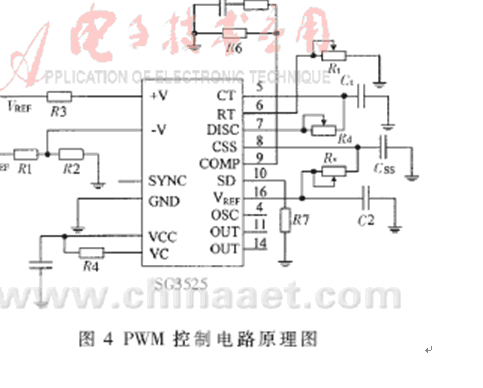 在以IGBT設(shè)計的逆變電源中,PWM控制電路是極其重要的組成部分,SG3525脈寬調(diào)制型控制器作為SG3524的改進(jìn)型,更適合于開關(guān)器件的雙端DC-DC變換器,它的外圍電路原理圖如圖4所示,輸出波形如圖5所示。