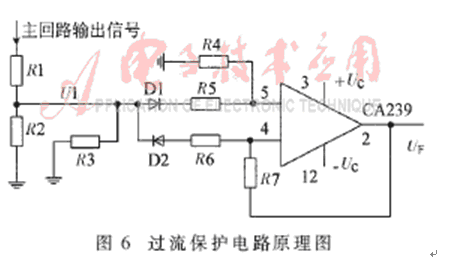 過電流保護(hù)電路的主要任務(wù)是檢測輸出電流的變化,并將其反饋到SG3525的控制端,在電流較大時可可靠關(guān)斷系統(tǒng),以避免器件的損壞。其電路原理如圖6所示。圖中,電阻R1、R2對主電路的輸出進(jìn)行采樣,當(dāng)輸出電路中電流增大到設(shè)定值時,采樣電壓U1隨之增大,該信號經(jīng)CA239反饋到SG3525的+V端,封鎖PWM脈沖。