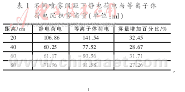 由表1可以看出,由于使用了等離子體荷電噴霧技術(shù),農(nóng)藥落在植株上的藥量有了明顯的增加,達(dá)到了設(shè)計要求。由表2可見,等離子體荷電與普通靜電噴霧相比,能在較小的放電電壓下得到較高的荷質(zhì)比。從而降低了農(nóng)藥的使用量,也減輕了對環(huán)境的污染。