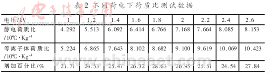 荷質(zhì)比是衡量霧滴荷電性能的重要指標(biāo),荷質(zhì)比越大,霧滴的荷電性能及充電效果越好,通過實驗手段可對霧滴荷電情況進(jìn)行測量。不同荷電情況下荷質(zhì)比測試數(shù)據(jù)如表2所示。