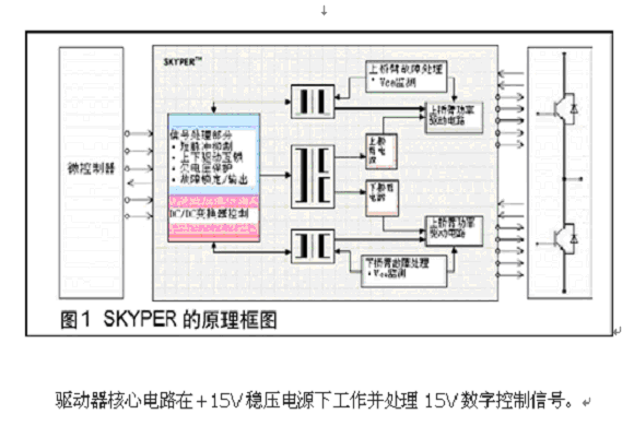 圖1是SKYPER驅(qū)動電路的原理框圖。該電路是一個半橋電路,它具備基本驅(qū)動電路所有的功能,如電勢隔離,保護(hù)功能如VCE監(jiān)測,短脈沖抑制,欠壓監(jiān)測以及死區(qū)時間。通過使用ASIC芯片以及基于基本驅(qū)動器功能的驅(qū)動器設(shè)計,它需要的元器件比傳統(tǒng)的驅(qū)動電路要少得多。