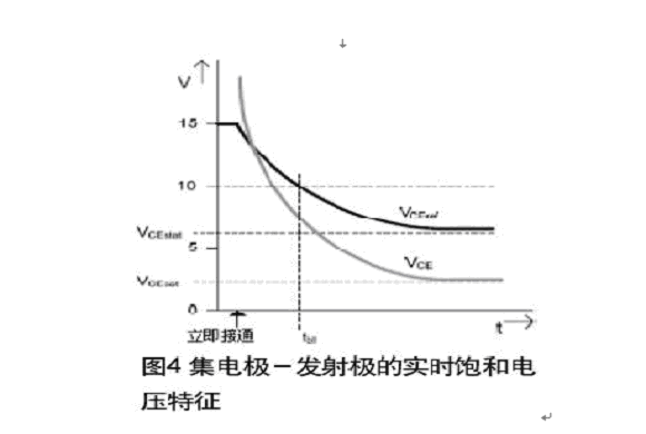 使用信號變壓器(脈沖變壓器)不僅可以提供高質(zhì)量的電氣隔離,它在原邊與副邊間還有很高的dv/dt(50kv/us)。與光耦構(gòu)成的驅(qū)動電路不一樣的是,信號變壓器可靠性好,號電路通道被互鎖,直到有復(fù)位脈沖對該電路進(jìn)行復(fù)位。在IGBT退飽和監(jiān)視中,必須考慮它的實時飽和電壓特征。在IGBT開通的最初幾個微秒,集電極-發(fā)射極電壓遠(yuǎn)高于穩(wěn)定后的VCEsat值。因此監(jiān)測電路的響應(yīng)特征在消隱時間內(nèi)(圖4)必須與VCEsat特征圖一致。