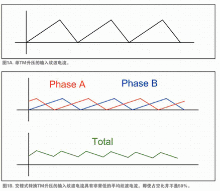 為了生產(chǎn)的更薄、高效而廉價的電源,近來開發(fā)了UCC28060,在單一設備中采用兩個交錯式轉(zhuǎn)換通道TM PFC的集成電路。UCC28060充分發(fā)揮了TM的全部優(yōu)勢,并利用交錯式轉(zhuǎn)換的優(yōu)勢來彌補TM的缺點。例如,如圖1A與1B所示,交錯式轉(zhuǎn)換降低了輸入紋波電流,所以可以使用小得多的EMI濾波器。交錯式轉(zhuǎn)換還降低了輸出波紋,可使用較小的輸出電容,并能延長電容壽命。交錯式轉(zhuǎn)換還可將一個大電感分成兩個較小的電感,提高了功率級別并實現(xiàn)了超薄的封裝。
