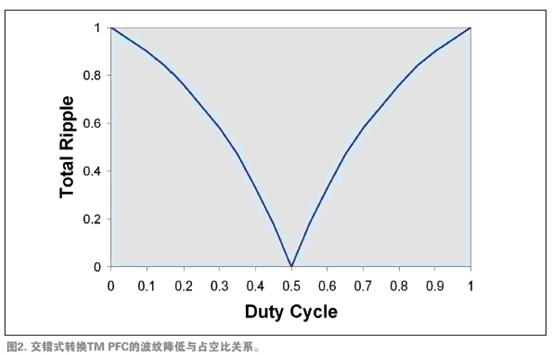 如果交錯式轉(zhuǎn)換電源轉(zhuǎn)換器以50%的占空比工作,第一相的輸入波紋完全抑制了第二相的輸入波紋,從而產(chǎn)生無開關(guān)成分的輸入電流,且不會產(chǎn)生EMI。在占空比偏離50%時,抑制作用降低,殘余波紋增大(參見圖2)。然而,波紋抑制多數(shù)的優(yōu)點還是實現(xiàn)了。