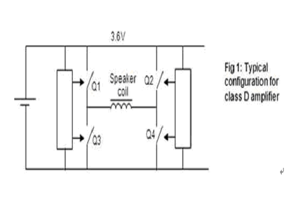 目前的移動(dòng)電話通常使用D類音頻放大器。這些放大器在一個(gè)H橋電路中采用了兩對(duì)FET來(lái)控制揚(yáng)聲器線圈。配置如圖1所示。Q1&Q4導(dǎo)通和Q2&Q3關(guān)斷時(shí)向一個(gè)方向驅(qū)動(dòng)揚(yáng)聲器線圈,Q1&Q4關(guān)斷和Q2&Q3導(dǎo)通
