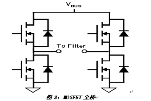 濾波之后,輸出橋產(chǎn)生一個50Hz的正弦電壓及電流信號。一種常見的實現(xiàn)方案是采用標準全橋結(jié)構(gòu) (圖2)。圖中若左上方和右下方的開關(guān)導通,則在左右終端之間加載一個正電壓;右上方和左下方的開關(guān)導通,則在左右終端之間加載一個負電壓。