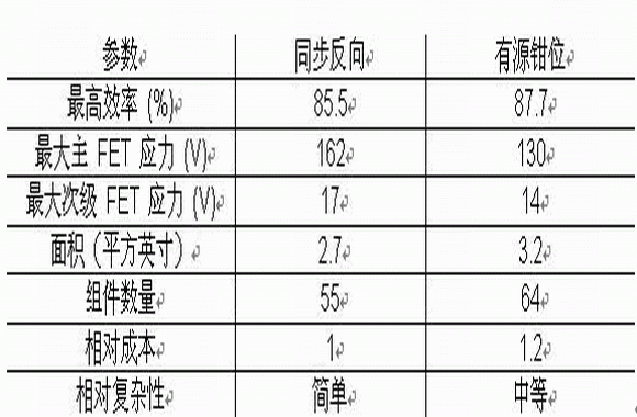 表 2 列出了對(duì)兩種同步反向電源主要部分進(jìn)行比較的總結(jié)。該表說(shuō)明了有源鉗位反向電源相對(duì)于變壓器驅(qū)動(dòng)同步反向電源在性能上的優(yōu)勢(shì)。尤其是在輕負(fù)載情況下,有源鉗位反向電源具有更低的 FET 電壓應(yīng)力及更高的效率。有源鉗位控制器 (UCC2897) 的可編程停滯時(shí)間特性(該特性可防止主、次級(jí) FET 的疊加傳導(dǎo) (overlapping conduction))有助于最小化 Q1 二次側(cè)直通損耗。這些損耗一般表現(xiàn)為可在主電流感應(yīng)電阻器上觀(guān)測(cè)到的一個(gè)大電流峰值,且經(jīng)常會(huì)導(dǎo)致輕負(fù)載抖動(dòng)的問(wèn)題。有源鉗位反向電源較低的高頻振鈴會(huì)產(chǎn)生更少的 EMI 及一個(gè)全局范圍內(nèi)更低噪聲的電源。由于漏極電感對(duì)有源鉗位電路性能的影響較小,因此,盡管同步反向電源并不是一無(wú)是處,但比起帶有同步反向的情況,高頻操作更有可能實(shí)現(xiàn)。在這兩個(gè)示例電路中,與有源鉗位反向電源相比,傳統(tǒng)的同步反向電源可將 PWB 面積、組件數(shù)量和成本上降低大約 15%~20%。這是一款容易設(shè)計(jì)和(可論證性地)理解的更簡(jiǎn)單的電路,雖然如此,但還是要考慮到其在性能上的一些不足。那么,您應(yīng)該在什么時(shí)候選擇一個(gè)有源鉗位反向電源呢?如果輸出功率較低,同時(shí)設(shè)計(jì)要求一直進(jìn)行連續(xù)模式運(yùn)行,那么有源鉗位反向電源可以實(shí)現(xiàn)高效率、低 EMI 運(yùn)行。在輕負(fù)載效率較為關(guān)鍵的應(yīng)用中,它具有一個(gè)更為明顯的優(yōu)勢(shì)。
