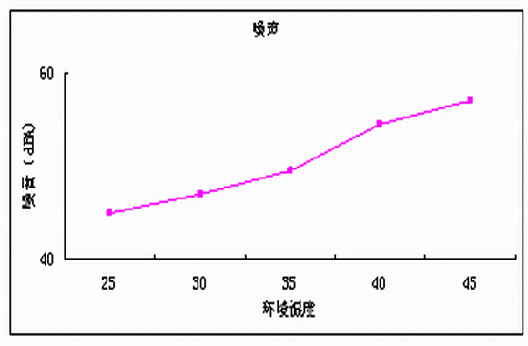 音頻噪聲污染主要控制方法是選用低噪音換熱單元,同時機柜采用消音措施。研究表明,換熱單元調(diào)速可有效的降低機柜噪音。圖5是某型戶外產(chǎn)品噪音水平與環(huán)境溫度關(guān)系曲線,從曲線可看出,采用調(diào)速后,隨著環(huán)境溫度減小,戶外柜噪音明顯降低。由于夜晚時環(huán)境溫度變低,因此采用該項技術(shù)的設(shè)備晚間有更低的噪音水平,非常符合實際應(yīng)用環(huán)境的需要。