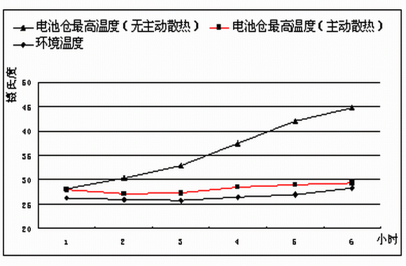 因此戶外電源設(shè)計中針對電池倉的環(huán)境控制非常關(guān)鍵。尤其在高溫環(huán)境中要有針對性的散熱措施,研究表明,傳統(tǒng)的自然開孔散熱難以滿足電池的應(yīng)用要求。在傳統(tǒng)的自然開孔散熱條件下,雖然蓄電池自身發(fā)熱量較小,但隨著環(huán)境溫度的升高,在蓄電池倉中的熱累積會逐步的升高電池倉的溫度,在太陽照射的條件下情況更為嚴重。如圖6所示,在自然散熱條件下(倉內(nèi)無主動散熱措施),電池倉內(nèi)溫度會遠高于環(huán)境溫度。在同樣的條件下,采用主動散熱技術(shù),電池倉內(nèi)溫度基本接近于環(huán)境溫度,電池工作條件會得到極大改善。根據(jù)此項研究結(jié)果,艾默生開發(fā)了電池倉獨立風(fēng)道散熱技術(shù),保證了電池倉的充分散熱,極大的改善了電池工作溫度,提高了電池壽命。