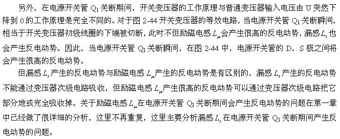 (2-140)式對(duì)于計(jì)算漏感 產(chǎn)生的反電動(dòng)勢(shì)或其它電感產(chǎn)生的反電動(dòng)勢(shì)同樣有效。漏感 中存儲(chǔ)的能量可根據(jù)(2-138)式求得;而流過(guò)漏感 的電流,對(duì)于反激式開(kāi)關(guān)電源:可認(rèn)為與勵(lì)磁電流的大小基本相等,因?yàn)椋诜醇な介_(kāi)關(guān)電源中,等效負(fù)載電阻等于無(wú)限大;對(duì)于正激式開(kāi)關(guān)電源:可認(rèn)為與流過(guò)等效負(fù)載電阻的電流大小基本相等,因?yàn)?,在正激式開(kāi)關(guān)電源中,勵(lì)磁電流相對(duì)于流過(guò)等效負(fù)載電阻的電流,很小。