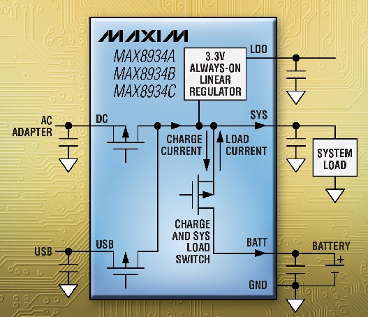 MAX8934可以采用獨(dú)立的USB和交流適配器電源輸入供電,也可用單個(gè)輸入連接兩種電源。直流輸入限流值最高可調(diào)節(jié)至2A,USB輸入限流值最高可調(diào)節(jié)至1.5A*。直流與USB輸入均支持100mA、500mA、1.5A和USB掛起模式。充電電流最高可調(diào)節(jié)至1.5A,支持較寬范圍的電池容量。器件的其它特性包括:防止過熱的熱調(diào)節(jié)環(huán)路、自適應(yīng)電池充電功能在滿足系統(tǒng)負(fù)載供電的前提下為電池充電、OVP (過壓保護(hù))、漏極開路充電狀態(tài)和故障指示輸出、電源就緒監(jiān)測(cè)器、充電定時(shí)器以及電池溫度監(jiān)測(cè)器。