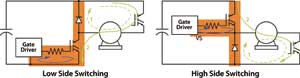目前,大功率半導(dǎo)體器件(如IGBT和MOSFET)的發(fā)展趨勢(shì)是在提升性能的前提下不斷縮小芯片尺寸。減小芯片尺寸能減少器件的寄生電容,從而提高開(kāi)關(guān)速率。因此,深入研究電路板上的關(guān)鍵回路越來(lái)越重要。圖1為電壓源變頻器(voltagesourceinverter,VSI)的兩種典型開(kāi)關(guān)工作方式的簡(jiǎn)化示意電路。在開(kāi)關(guān)頻率受限的大電流應(yīng)用中,IGBT是最受歡迎的器件。上圖所示為從高壓側(cè)(HS)續(xù)流二極管到低壓側(cè)IGBT的換流。電流最初是在高壓側(cè)二極管和相應(yīng)反相半橋的IGBT形成的續(xù)流通道中。
