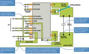 與電壓源變頻器的分立元件方案類(lèi)似,采用智能功率模塊時(shí)也要注意外部元件的布局安排。圖3所示為針對(duì)Motion-SPMTM應(yīng)用的一些建議。由于電壓源變頻器的開(kāi)關(guān)速率很快,信號(hào)接地和功率接地必須分開(kāi)。兩種接地在15VVcc電容處互接。Vcc電容和功率接地之間的通道要狹窄,以去除耦合。為防止電涌造成破壞,引腳P與功率接地之間應(yīng)當(dāng)有一個(gè)低電感電容。另外,由于電壓源變頻器和馬達(dá)之間的長(zhǎng)引線(xiàn)會(huì)造成高壓反射,因此一些SPM產(chǎn)品配備了外接?xùn)艠O電阻來(lái)調(diào)節(jié)開(kāi)關(guān)速率和最大限度地減少反射。