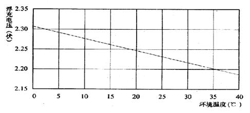 在電源系統(tǒng)中,電池總是在線備用工作的,這樣電池基本處于長期的浮充狀態(tài)中,浮充電壓的選取對電池的長期可靠運行起著至關重要的作用。正如前面看到的,偏高的浮充電壓會造成電池緩慢失水并產生熱失控而使電池失效;偏低的浮充電壓會造成電池長期處于充不飽電的狀態(tài),使電池發(fā)生硫酸化而導致電池失效。正確的浮充電壓一般應選在2.23V-2.25V/單體,并應隨同電池工作溫度進行相應調整。由于電池生產廠家的不同,這一參數(shù)會有一些差異,應嚴格按照廠家提供的參數(shù)選取。圖1是某廠家電池浮充電壓同溫度的關系曲線。