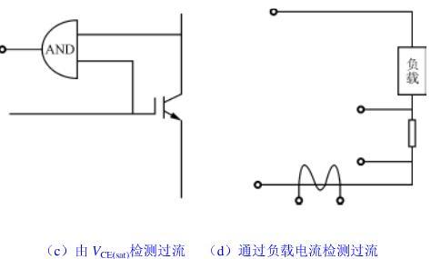 此方法與圖5(a)中的檢測方法基本相同,但圖5(a)屬直接法,此屬間接法,如圖5(d)所示。若負(fù)載短路或負(fù)載電流加大時,也可能使前級的IGBT的集電極電流增大,導(dǎo)致IGBT損壞。由負(fù)載處(或IGBT的后一級電路)檢測到異常后,控制執(zhí)行機構(gòu)切斷IGBT的輸入,達到保護的目的。