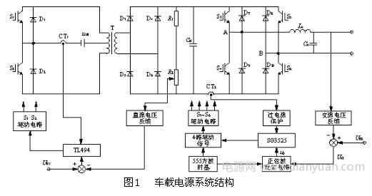 車載電源系統(tǒng)如圖1所示。12V直流電壓經(jīng)過高頻逆變和高頻整流,得到一個(gè)符合要求的350V直流電壓,該部分的控制信號(hào)由TL494芯片產(chǎn)生。