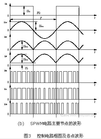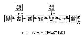 要得到正弦電壓的輸出,就要使逆變電路的控制信號(hào)以SPWM方式控制功率管的開關(guān),所得到的脈沖方波輸出再經(jīng)過濾波就可以得到正弦輸出電壓。通過SG3525來實(shí)現(xiàn)輸出正弦電壓,首先要得到SPWM的調(diào)制信號(hào),而要得到SPWM調(diào)制信號(hào),必須得有一個(gè)幅值在1~3.5V,按正弦規(guī)律變化的饅頭波,將它加到SG3525腳2,并與鋸齒波比較,就可得到正弦脈寬調(diào)制波實(shí)現(xiàn)SPWM的控制電路框圖如圖3(a)所示,實(shí)際電路各點(diǎn)的波形如圖3(b)所示。