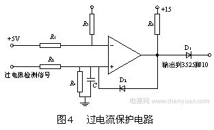 過電流保護(hù)采用電流互感器作為電流檢測(cè)元件,其具有足夠快的響應(yīng)速度,能夠在IGBT允許的過流時(shí)間內(nèi)將其關(guān)斷,起到保護(hù)作用。如圖1所示,過流保護(hù)信號(hào)取自CT2,經(jīng)分壓、濾波后加至電壓比較器的同相輸入端,如圖4所示。當(dāng)同相輸入端過電流檢測(cè)信號(hào)比反相輸入端參考電平高時(shí),比較器輸出高電平,使D2從原來的反向偏置狀態(tài)轉(zhuǎn)變?yōu)檎驅(qū)ǎ淹喽穗娢惶嵘秊楦唠娖?,使電壓比較器一直穩(wěn)定輸出高電平。同時(shí),該過電流信號(hào)還送到SG3525的腳10。當(dāng)SG3525的腳10為高電平時(shí),其腳11及腳14上輸出的脈寬調(diào)制脈沖就會(huì)立即消失而成為零。