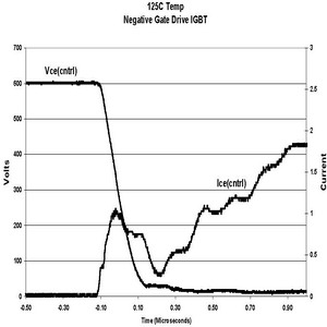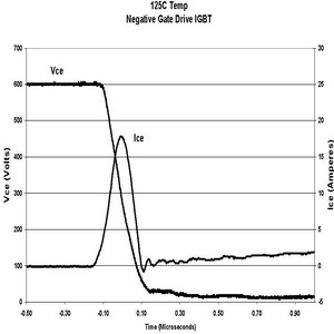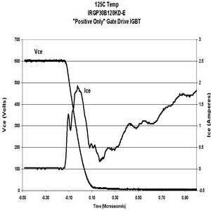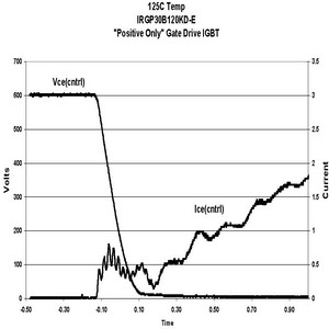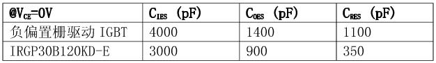 在相同的測試條件下,當柵電壓是在0V或單正向柵驅(qū)動情況下,IRGP30B120KD的電路性能顯示dV/dt感生開通電流減小比例為21:1。如果IGBT采用這種方式驅(qū)動,電流很小,對功耗的影響幾乎可以忽略。