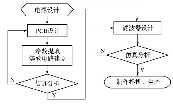 如果以上所有降低EMI的措施都完成了還沒有達到EMC的標準,就可以根據(jù)前面仿真分析得到的差模和共模干擾的波形對濾波器進行設計。在設計濾波器的時候,也同樣要注意元件的布局,還有PCB寄生參數(shù)對濾波器阻抗的影響,其本質(zhì)也是增大對干擾的阻抗,使干擾無法通過傳播路徑。開關電源設計流程如圖5所示。